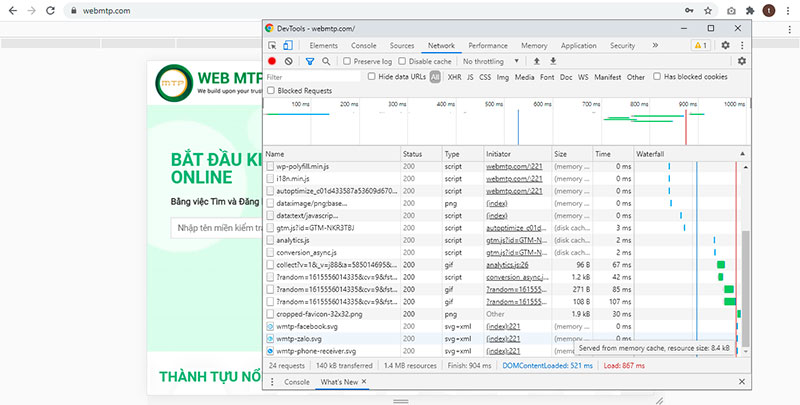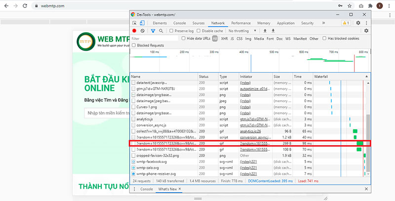 Sau đó, các bạn nhấn phím F5 trên bàn phím nhiều lần, đến khi tìm thấy dòng liên kết tải mất nhiều thời gian nhất. Ở đây, website của mình đã được tối ưu hóa website, nên liên kết tải chậm nhất trang chủ của mình được khoanh vùng như hình dưới. Và tổng thời gian load cả trang chủ, chỉ mất 741 mili giây. Quá nhanh phải không nào.