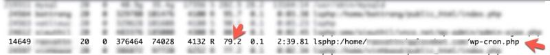 Một đặc điểm của việc WP Cron dùng nhiều tài nguyên đó là tập tin wp-cron.php luôn chạy với mức sử dụng CPU cao, cái này bạn chỉ có thể xem được khi xem với lệnh top trong máy chủ Linux.